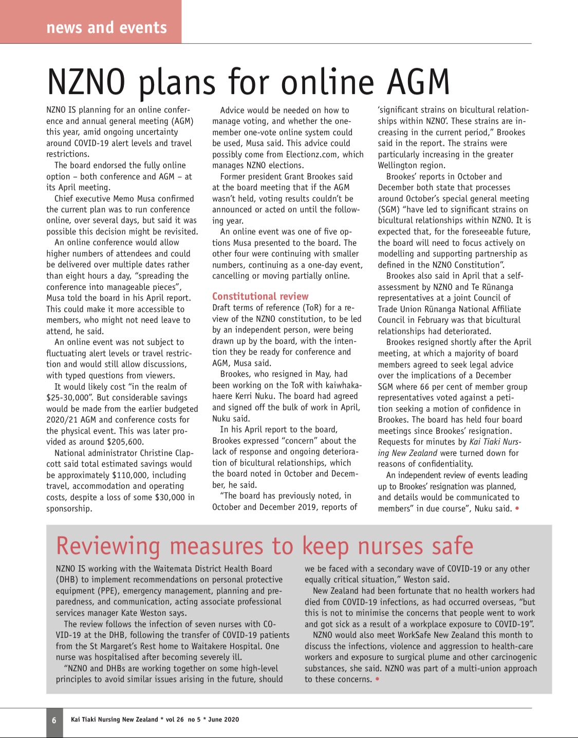 The Board of Directors has decided not to hold an NZNO Annual General Meeting (AGM) in Wellington this September, and to press on instead with preparations for a shorter and smaller meeting via Zoom. The reason given is “uncertainty around COVID-19 alert levels and travel restrictions” (‘NZNO plans for online AGM’, June Kai Tiaki).