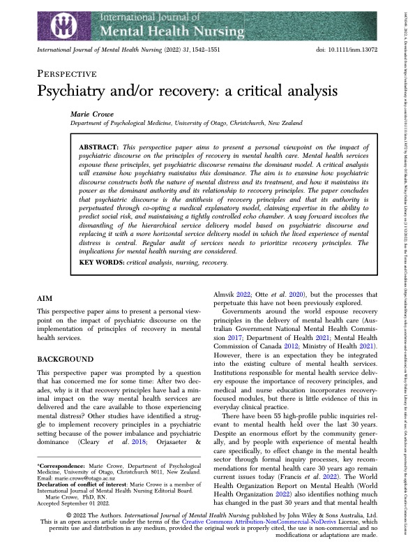 Crowe, M. (2022), Psychiatry and/or recovery: a critical analysis. Int J Mental Health Nurs, 31: 1542-1551. https://doi.org/10.1111/inm.13072